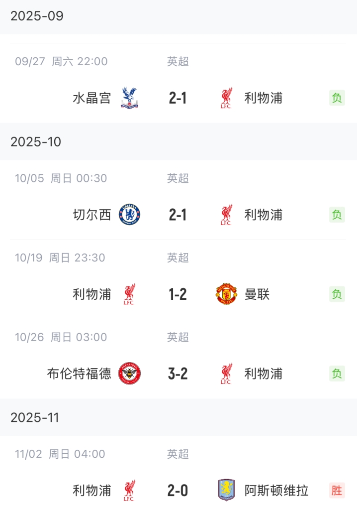 英超近6轮5负利物浦终结4连败后再输曼城,下轮主场战森林